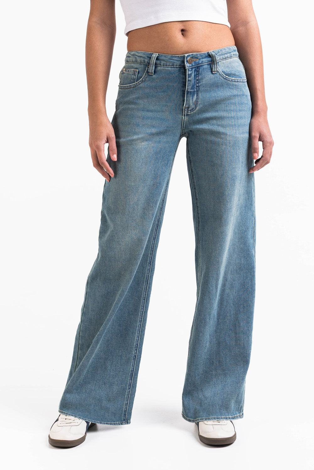Mid waist jeans met wijde pijpen en zakken aan de voor- en achterkant. Riemlussen die geschikt zijn voor zowel smallere als bredere riemen. De broek sluit met een ritssluiting en knoop.