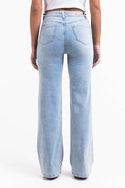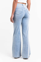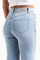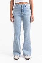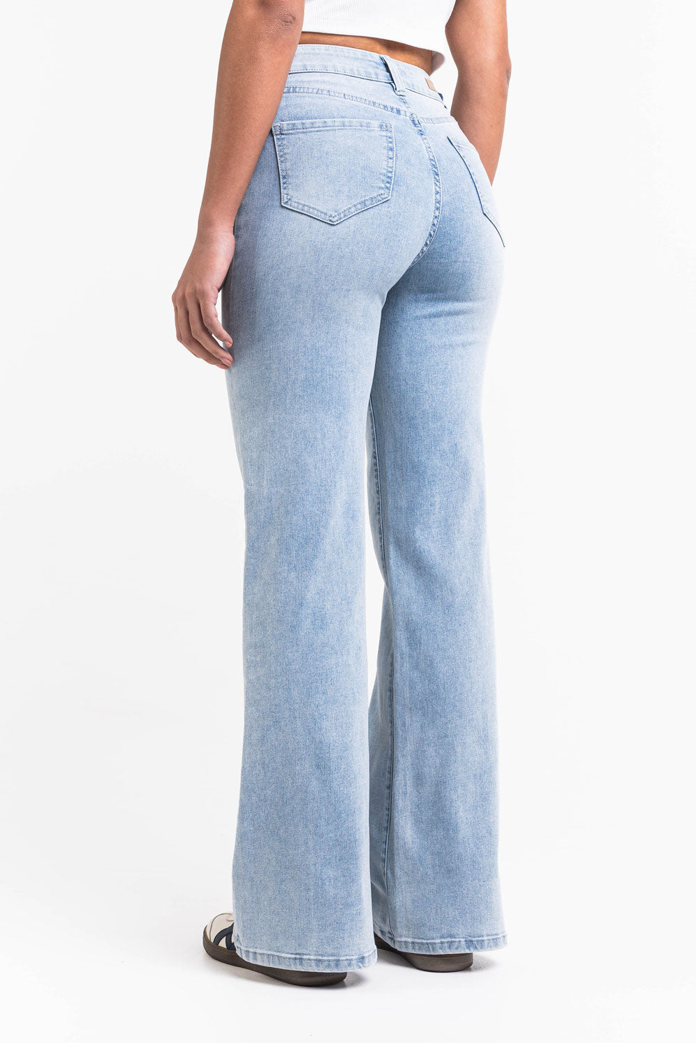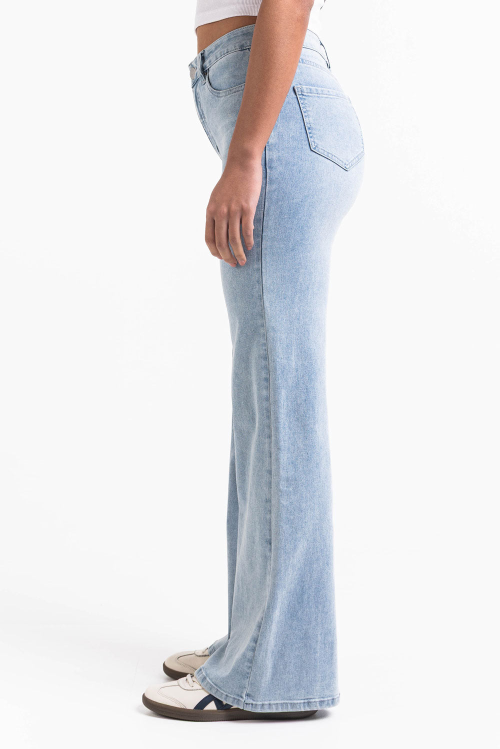 Jeans met hoge taille en uitlopende pijpen met zakken aan de voor- en achterkant. De jeans sluiten met een ritssluiting en knoop en hebben riemlussen die geschikt zijn voor zowel bredere als smallere riemen.