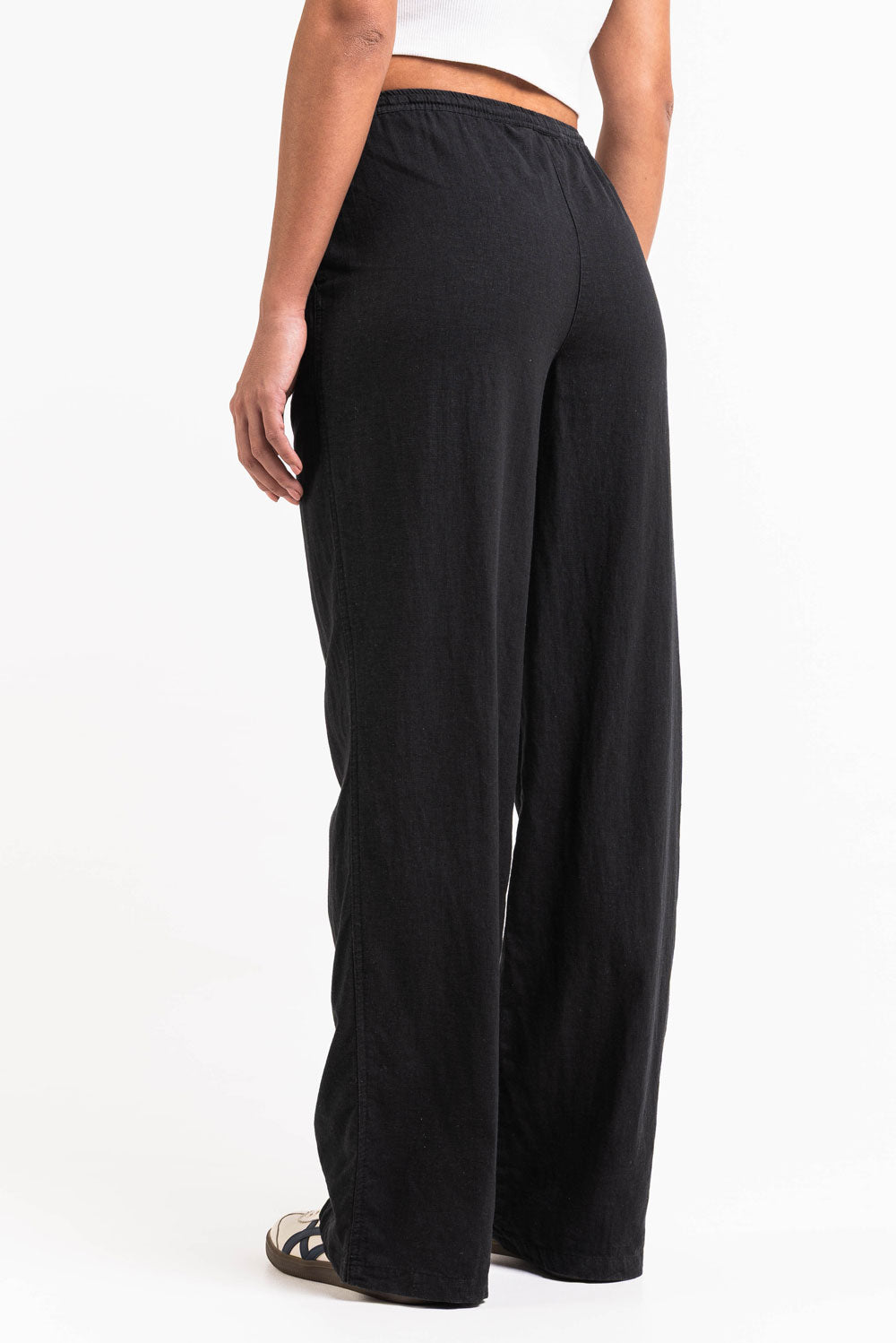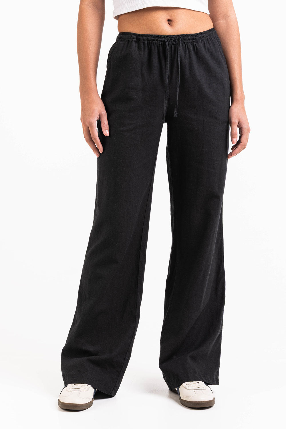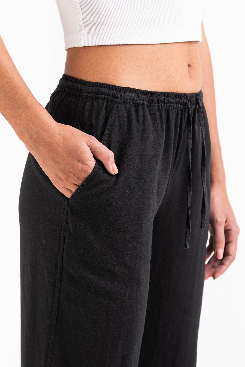 Deze linnen broek met middelhoge taille heeft een ontspannen rechte pasvorm met zijzakken voor functionaliteit. De elastische taille, het trekkoord en het omvouwbare ontwerp zorgen voor een stevige pasvorm terwijl de broek licht en luchtig blijft.