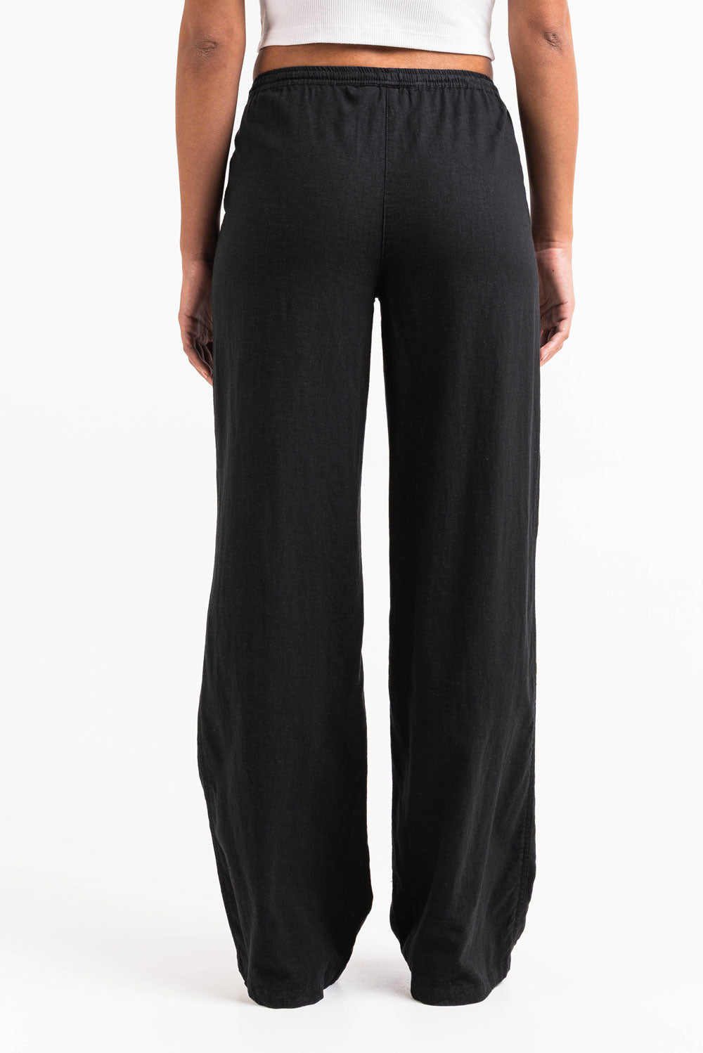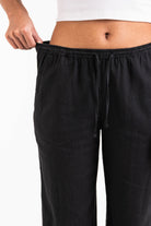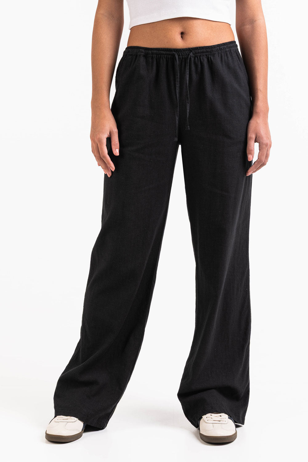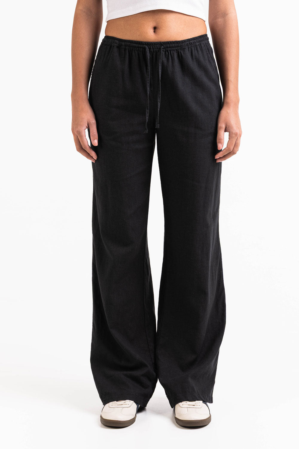 Deze linnen broek met middelhoge taille heeft een ontspannen rechte pasvorm met zijzakken voor functionaliteit. De elastische taille, het trekkoord en het omvouwbare ontwerp zorgen voor een stevige pasvorm terwijl de broek licht en luchtig blijft.