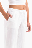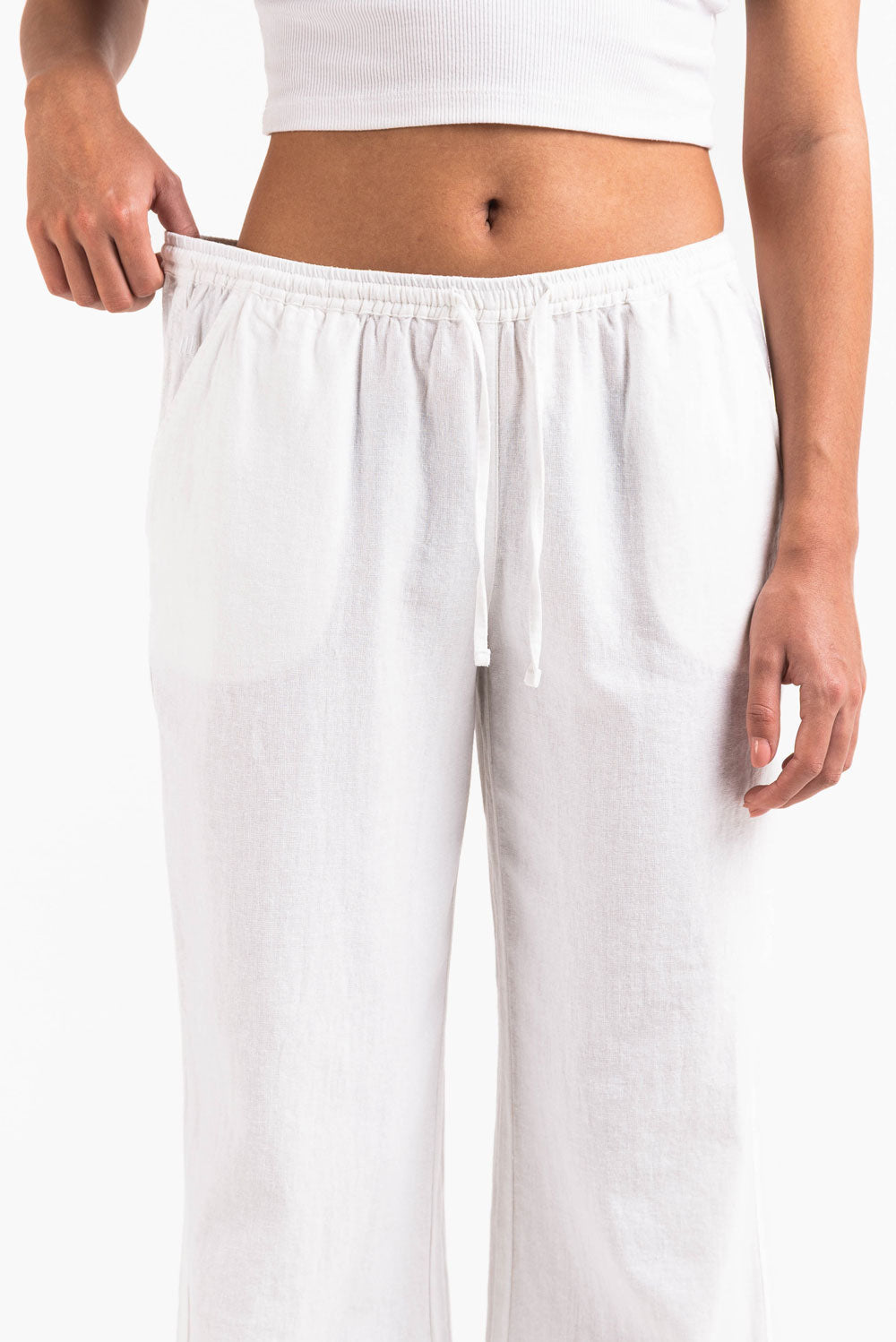 Deze linnen broek met middelhoge taille heeft een ontspannen rechte pasvorm met zijzakken voor functionaliteit. De elastische taille, het trekkoord en het omvouwbare ontwerp zorgen voor een stevige pasvorm terwijl de broek licht en luchtig blijft.