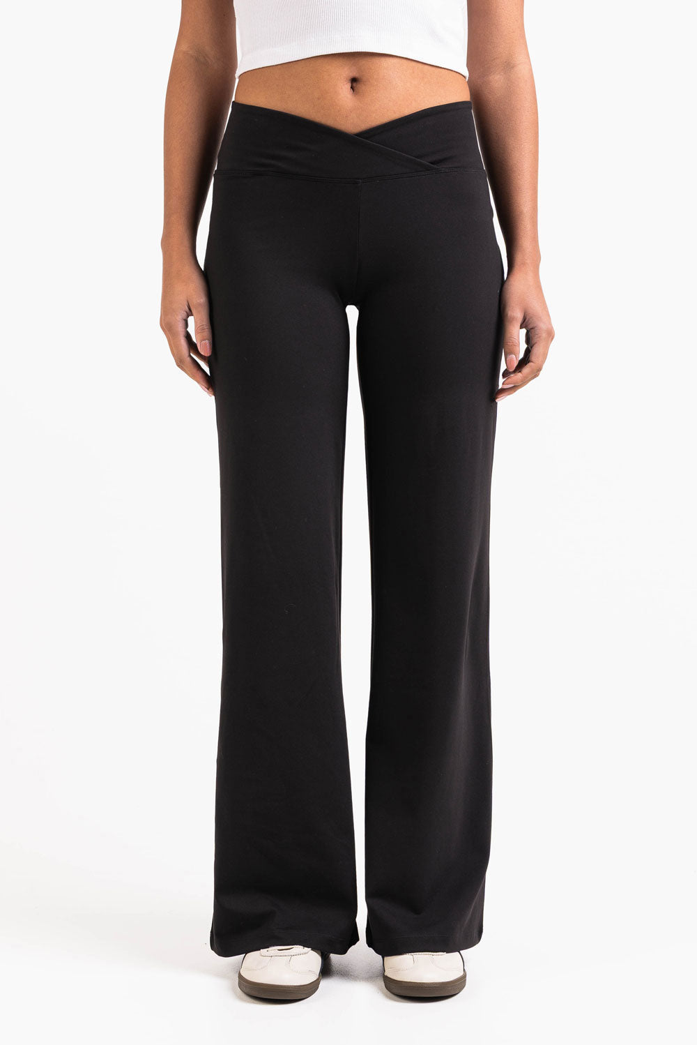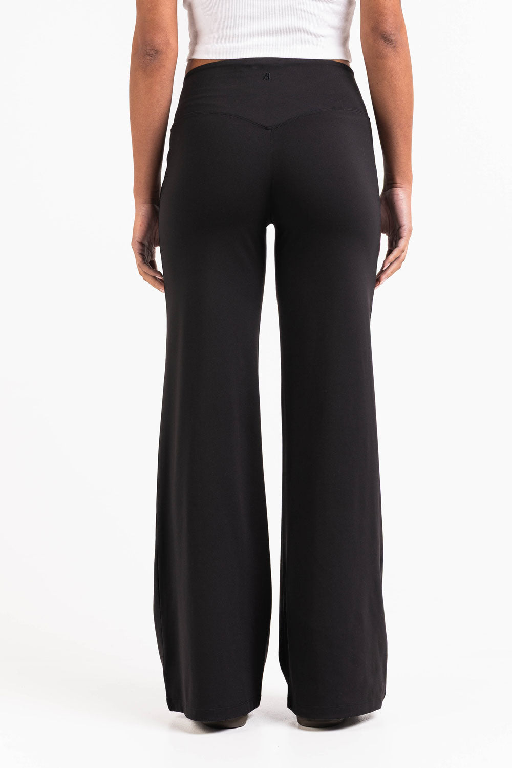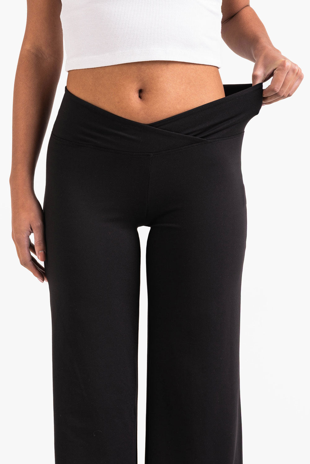 Deze leggings met een flatterende V-vormige tailleband hebben wijde pijpen met een naadloos ontwerp zonder zakken. Een elastische taille zorgt voor flexibiliteit, waardoor deze leggings perfect zijn voor zowel actieve als ontspannen dagen.